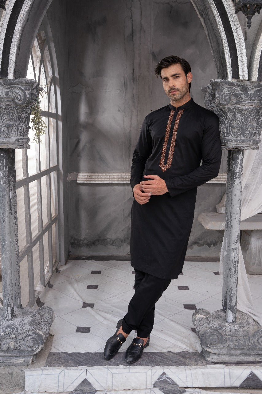 Product Category: Men Kashmiri Embroidered Wash-N-Wear Fabric by TAQWAA. Unstitched Kameez Shalwar with Cotton Thread Embroidery in Signature Pattern Design.